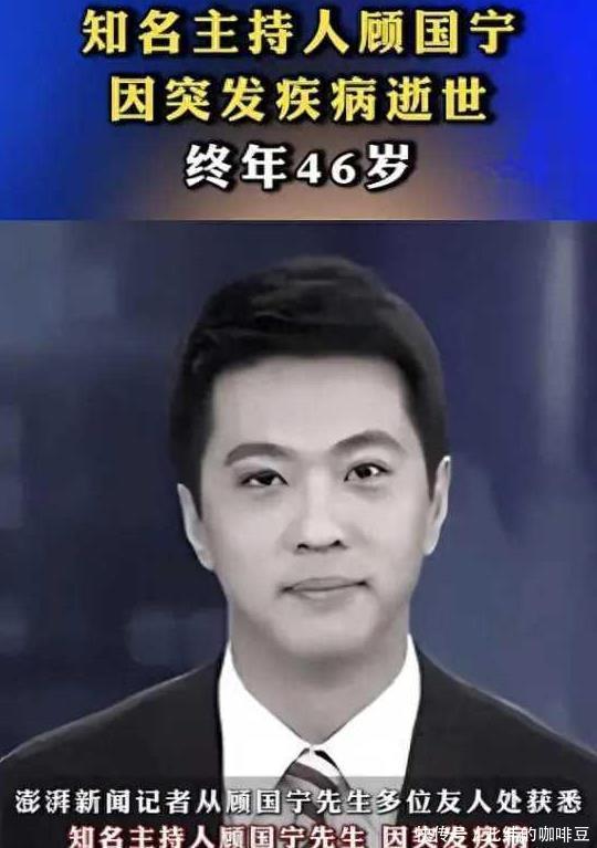 从确诊到离世仅15天,年仅46岁的前央视主持顾国宁,给大家提醒了。 突然离世 顾国宁曾经是央视的知名主持人,不管是年轻的时候还是步入四十来岁颜值依旧很抗打,骨子里有一种莫名的绅士气质, 去年十月的一天网络上传出的一则消息让很多人不敢相信,年仅46岁的顾国宁去世了, 在消息刚曝出来的时候很多人都不敢相信,毕竟他实在太年轻之前也没有什么预兆,给人一副很健康的感觉,