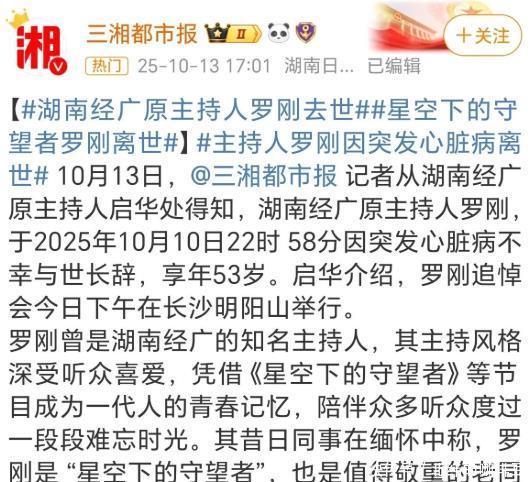 回头来看不管是顾国宁还是罗刚都是因为身体原因离世,这也给大家敲响“警钟”, 在生活中要保持一个好的生活习惯以及心情,这样才能有一个好的身体状态,毕竟命没了钱还没花完的例子比比皆是。 不知道您对此有什么看法呢?欢迎在下方评论区留下你的想法,喜欢文章记得点赞关注我们下期再见。 [免责声明]文章的时间、过程、图片均来自于网络,文章旨在传播正能量,均无低俗等不良引导,请观众勿对号入座,并上升到人身攻击等方面。观众理性看待本事件,切勿留下主观臆断的恶意评论,互联网不是法外之地。本文如若真实性存在争议、事件版权或图片侵权问题,请及时联系作者,我们将予以删除。 信息来源: 百度百科:顾国宁、罗刚个人资料 原央视主持人顾国宁逝世,年仅46岁!曾主持《朝闻天下》《午夜新闻》等节目|聚焦三农|阳光大道|午夜新闻(中国中央电视台).网易新闻 央视主播顾国宁:笨鸟能先飞不断“折腾”自己.新华网 因突发心脏病,湖南知名主持人罗刚逝世.腾讯(成都商报红星新闻).2025-10-13 #湖南经广原主持人罗刚去世##星空下的守...来自三湘都市报-微博.weibo.com.2025-10-13