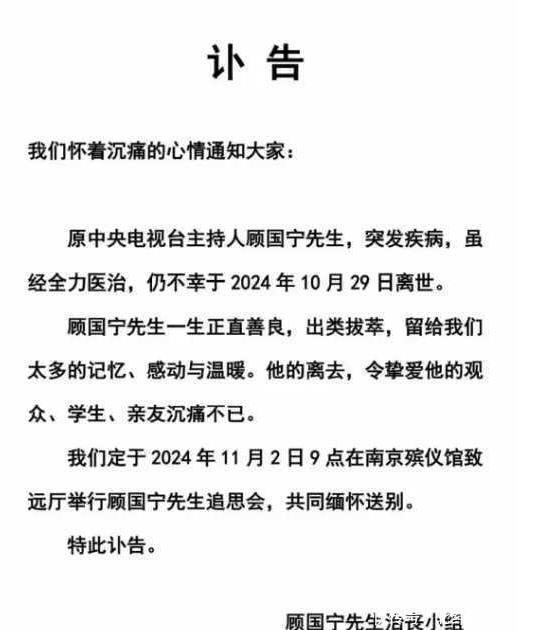 在阅读此文之前,辛苦您点击一下“关注”,既方便您进行讨论和分享,又能给您带来不一样的参与感,感谢您的支持! 爆款 编辑丨 百万 你永远都不知道明天迎接我们的是开朗大笑还是低落沮丧,也预料不到生命会在哪一天画上句号, 从小人物到知名主持人顾国宁的一生短暂且耀眼,他的突然离世令人意难平,生命无常啊!